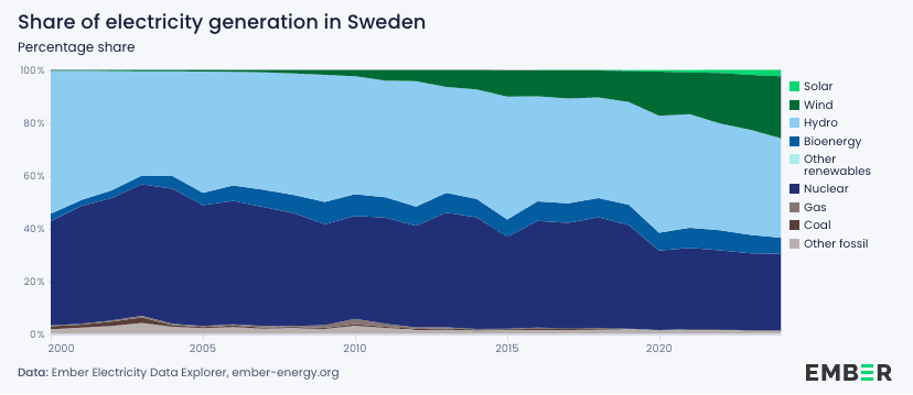 Pouke od predvodnika: Švedski energetski miks postao je sve diverzificiraniji – i stalno čišći – u posljednjih 15 godina. Nacija također često ima najniže troškove proizvodnje energije u Europskoj uniji, prema podacima Embera.