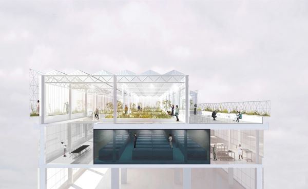 Prizemlje je iskorišteno za restoran sa zdravom i organskom hranom od koje je većina trebala doći sa viših katova te zgrade. Prvi je kat nazvan staklenik. Istina, na njemu Leafy Green Machine, tj. vertikalno postavljena valovita oplata transportnih kontejnera sa svojom mikroklimom i LED rasvjetom, daje 80 kilograma zelene salate tjedno, ali taj kat nije prozvan staklenikom zbog uzgoja povrća.