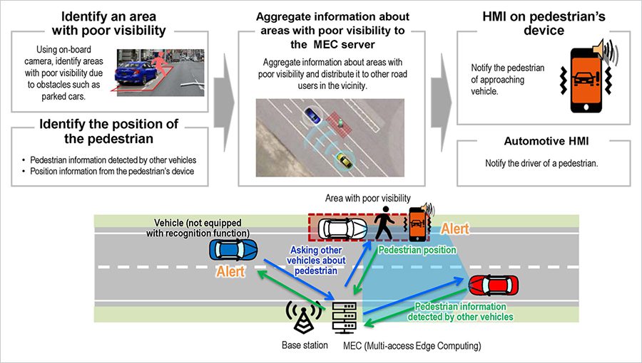 U okruženju u kojem se pješak ne može vidjeti iz vozila u pokretu zbog prepreka kao što su parkirani automobili uz cestu, vozilo provjerava s mobilnim uređajima i drugim vozilima u blizini prisutnost ili odsutnost pješaka na području s lošom vidljivošću.
