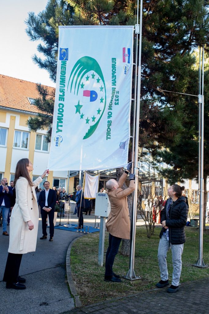 Zastavu Europske regije sporta, koja će biti izvješena tijekom cijele godine ispred zgrade Međimurske županije, podigli su Filip Ude, osvajač olimpijskog, svjetskog i dvostrukog europskog srebra, višestruki prvak Hrvatske na konju s hvataljkama i rekorder po broju naslova sportaša Međimurja, koji je ambasador projekta EU regije sporta, Lucija Lesjak, brončana na nedavno održanom Svjetskom prvenstvu u karateu i svjetska prvakinja u konkurenciji mlađih seniora te Antonija Ružić, najbolja juniorka Europe koja je, iako ima tek 18. godina, trenutačno 336. igračica WTA ljestvice.